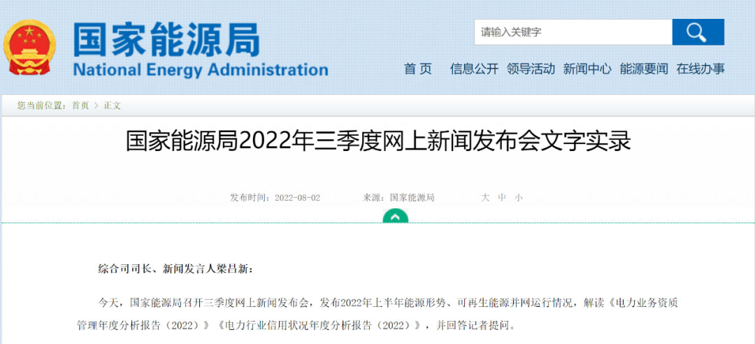 近日,國家能源局召開三季度網(wǎng)上新聞發(fā)布會(huì),發(fā)布2022年上半年能源形勢、可再生能源并網(wǎng)運(yùn)行情況,并回答記者提問。